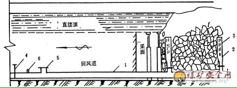 ②在工作麵中部至上隅角可砌築密閉牆或擋風牆,以減少采麵向采空區的漏風,牆體可用磚、料石或編織袋裝煤矸砌築的方式,麵上抹灰漿增加其密封性。